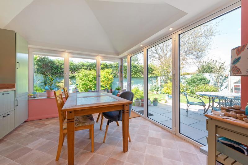 8 Clovelly Avenue is a semi-detached house located in a quiet and popular location. From the front door and inner hallway there is a door to the open plan Sitting / Dining Room which runs across the front of the property, with windows to the front and side. There is an open fireplace in the living room. The kitchen has been thoughtfully extended to create a superb area for dining and entertaining. The kitchen has a range of fitted units and space for a fridge freezer and washing machine, ample counter-top space running the length of the dining area and there is also a larder cupboard. The dining area has lovely views across the pretty garden and bi-fold doors to the terrace beyond. There is also a ground floor shower room with W.C. On the first floor the main bedroom measures over 19ft in length and has an airing cupboard, eaves cupboard and built-in wardrobes. Bedroom 2 and the family bathroom have windows to the side. At the rear of the property is an enclosed, lawned garden with a terrace adjacent to the rear of the house and a further terrace in the southerley corner. There is a store and gated access to the front, where there is a lawned area, driveway for off-road parking and the single garage which has an up and over door.