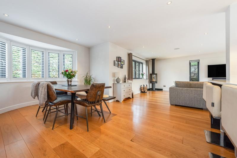 This exceptional home has been thoughtfully extended and modernised, offering an excellent balance of open-plan living and versatile accommodation. The welcoming entrance hall leads into an impressive open-plan kitchen / dining / living space, beautifully designed with a bright triple-aspect layout. A feature bay window to the front, while a corner log burner creates a striking focal point. Bi-fold doors open onto the rear terrace, creating an ideal space for entertaining. A remote-controlled, wind-sensing sun awning adds both comfort and practicality. The contemporary kitchen is fitted with a range of integrated appliances, complemented by ample work surfaces. A separate utility room and ground floor cloakroom add additional convenience. Further ground floor space includes a versatile front reception room, suitable for use as an additional bedroom if required, along with a separate study to the rear with direct access to the garden. To the first floor, the principal bedroom benefits from a stylish en-suite shower room and fitted wardrobes. Bedroom two is particularly spacious (approx. 20ft), while bedroom three features a vaulted ceiling, adding additional character. A contemporary family bathroom completes the first floor.