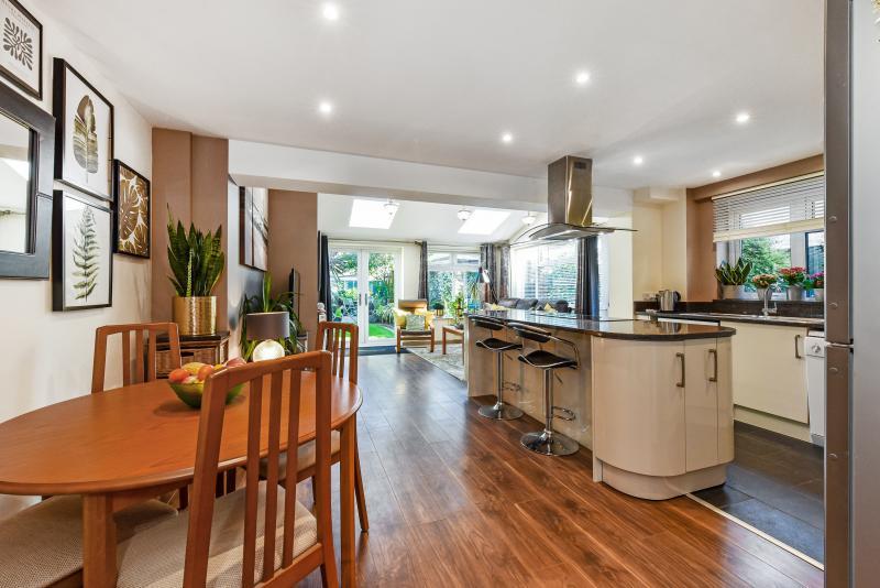 From the enclosed entrance porch, the front door opens into a good size entrance hall. There is a door through to the sitting room with fireplace and this opens to the impressive kitchen diner. There is a central island unit with induction hobs, a range of modern fitted units and a double eye-level microwave and combination ovens. This in turn opens to the garden room with vaulted ceiling with roof lights. With an outlook and French doors to the rear garden, and a side door leading out to the driveway. There is a useful ground floor W.C.  On the first floor of the house, there are two double bedrooms and a single bedroom, all with fitted cupboards. The modern family bathroom has bath, with shower over, and a W.C. and wash hand basin. There is also a great size loft space with three roof lights.